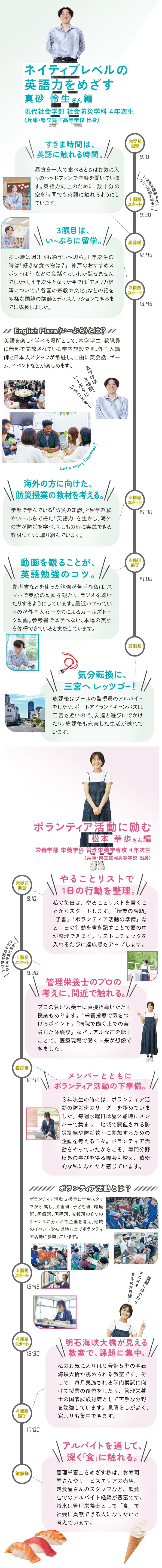 神戸学院大学には、「ハイレベルな英語スキルの修得」や「管理栄養士の国家試験合格」など夢に向かって日々励んでいる学生がいます。