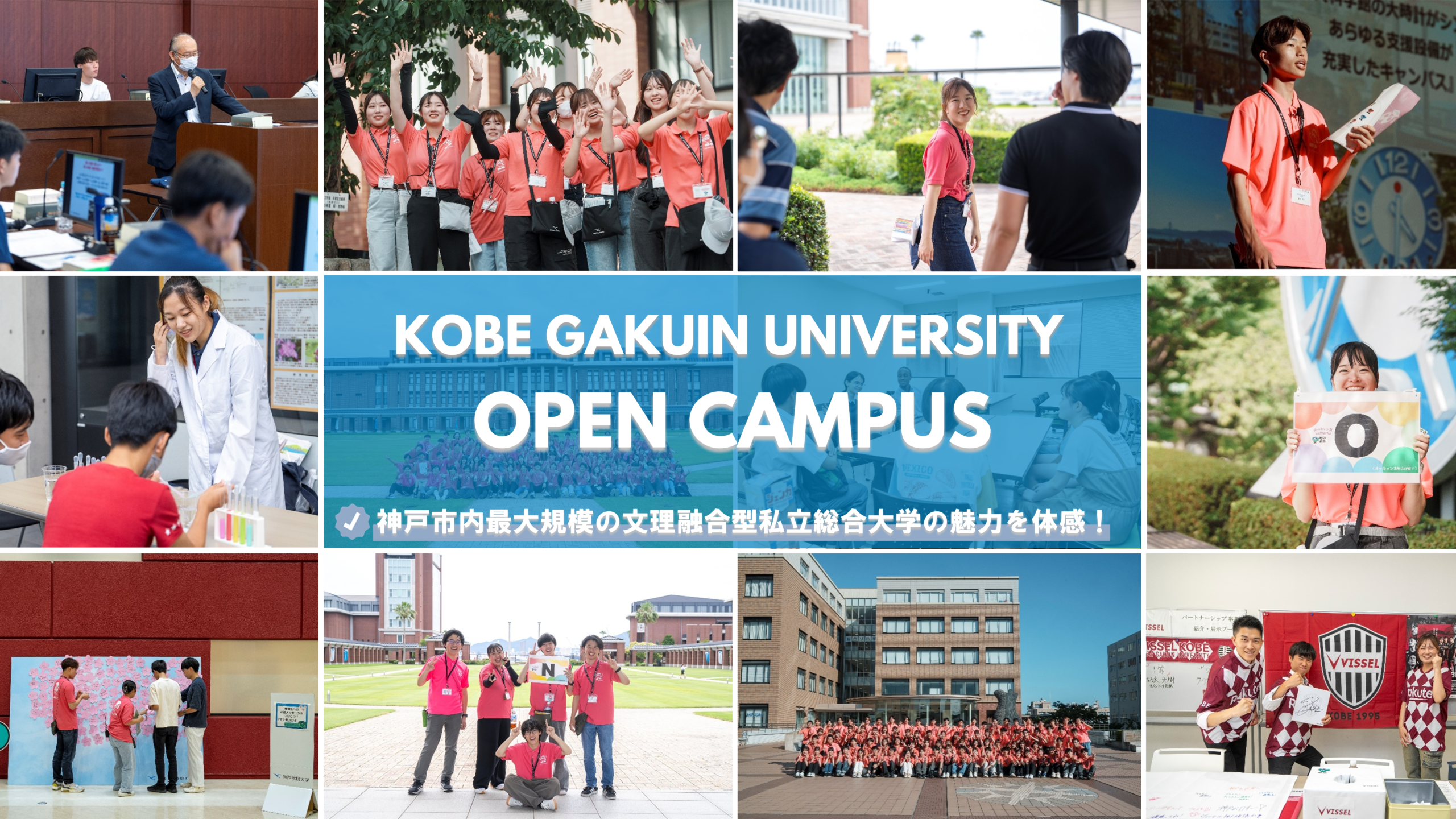 2027年度入試の最新情報をはじめ、さまざまなプログラムを用意して皆さまのご来場をお待ちしております。神戸学院大学をリアルに体感できる絶好の機会ですので、ぜひお申込みください。